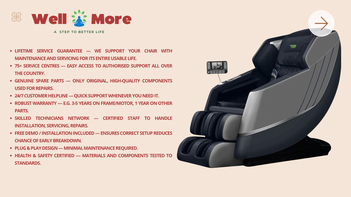 At Wellmore, we’re dedicated to enhancing wellbeing through premium massage chairs and fitness equipment. Founded on the belief that health and relaxation go hand‑in‑hand, we design and supply products that help you rejuvenate, stay fit, and enjoy comfort in your own space.